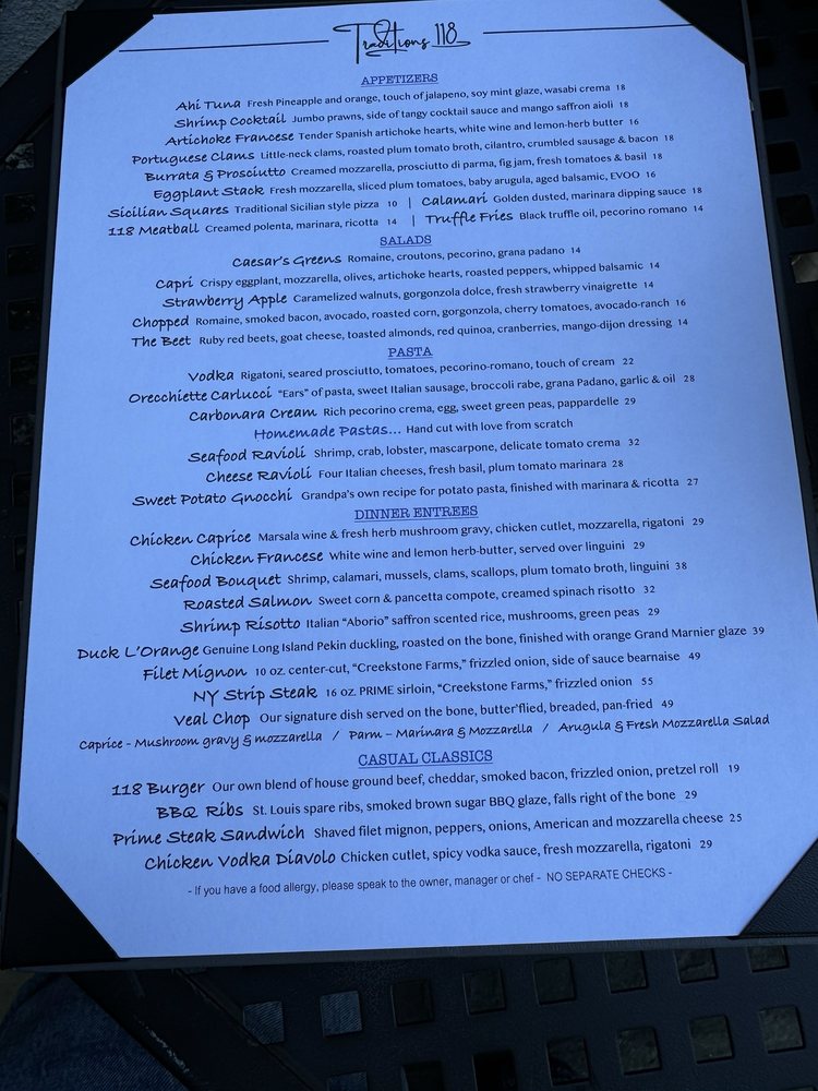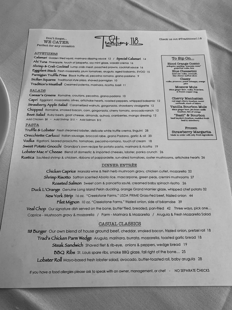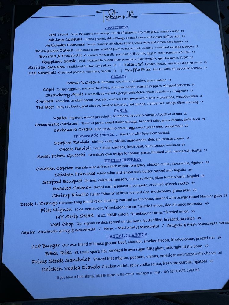 Traditions 118 Restaurant Menu